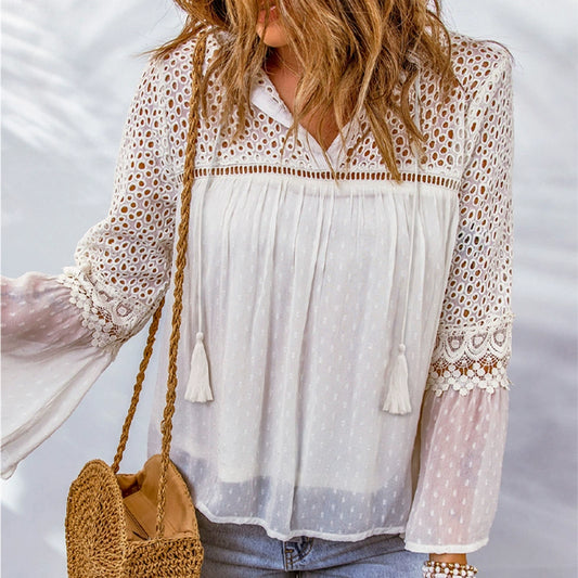 2024 Fall and Winter New Arrival Lace Crochet Chiffon Shirt for Women Fashion Fashion V Neck Drawstring Patchwork Cut Out Long Sleeves Shirt