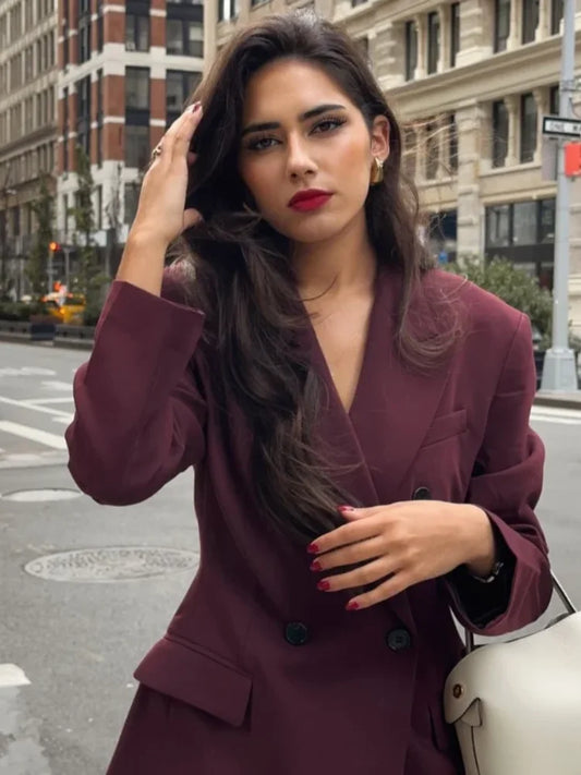 Wine Red Women's Blazer Coat Fashion Long Sleeve Lapel Double Breasted Female Coats 2024 Autumn Winter Slim Lady Outwear