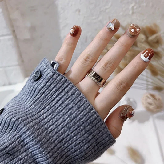 10Pcs Brown Handmade Press on Nails Short Square Chocolate Bear Design Nail Tips Cute Acrylic False Nail for Women/Girls Autumn