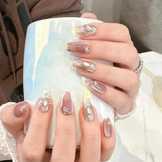 10PCS Pink Cat Eye Handmade Press On Nails Square Head Fake Nails Diamond Designs Full Cover Nail Art Tips Wearable False Nails