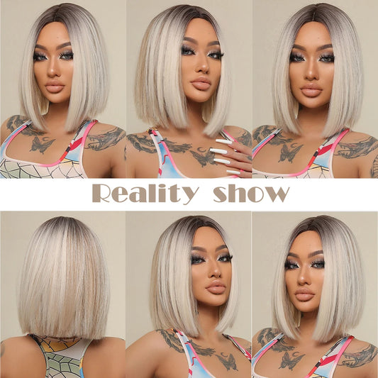 Brown Blonde Ombre Synthetic Wigs Short Straight Bob Wigs for Women Middle Part Lolita Cosplay Natural Hair Heat Resistant Fiber