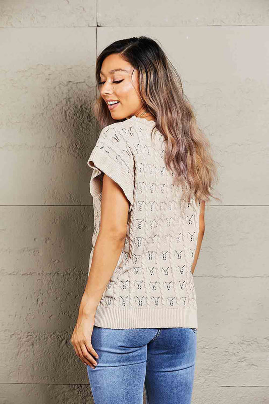 Double Take Round Neck Short Sleeve Cable-Knit Top