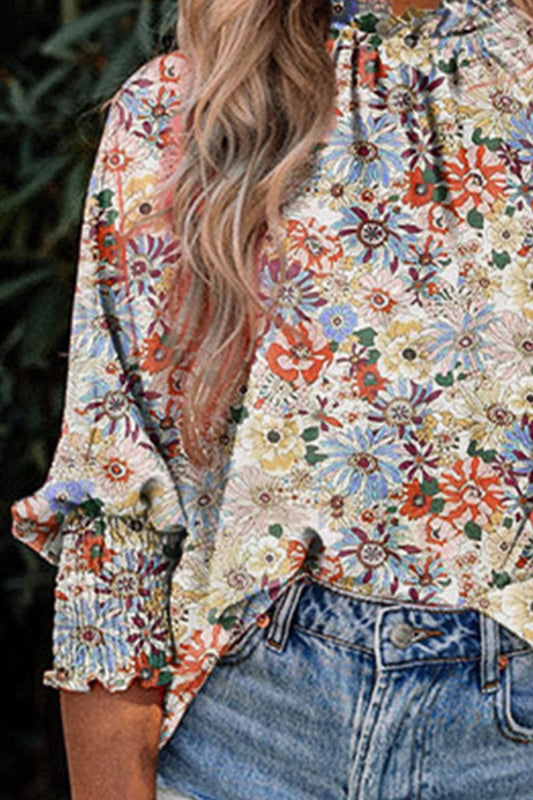 Floral Print Mock Neck Lantern Sleeve Blouse