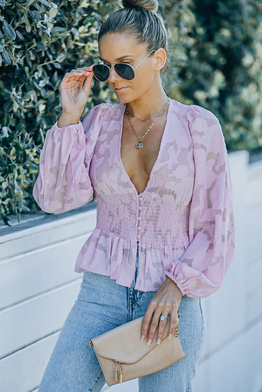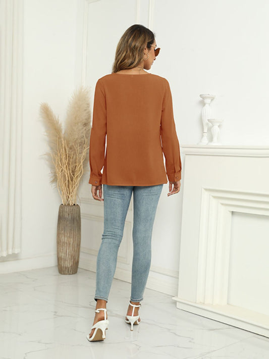 Roll-Tap Long Sleeve V-Neck Buttoned Blouse