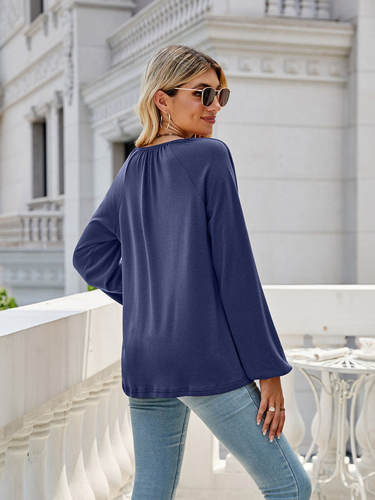 Ribbed Knit Henry Collar Loose Fitting Long Sleeve Top