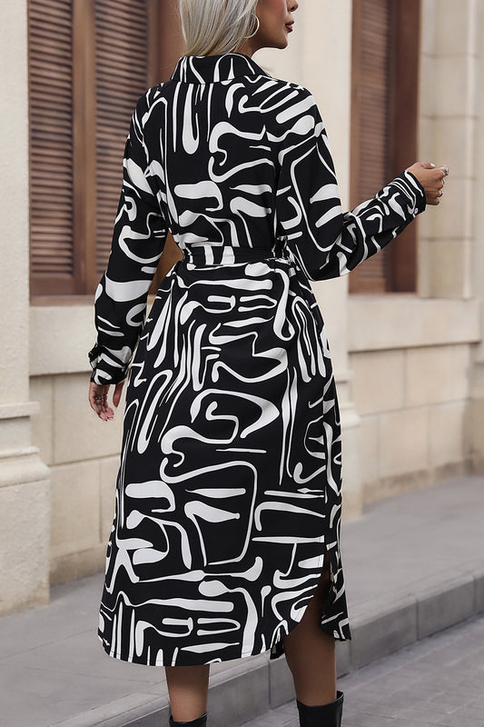 Printed Tie Front Collared Neck Slit Shirt Dress
