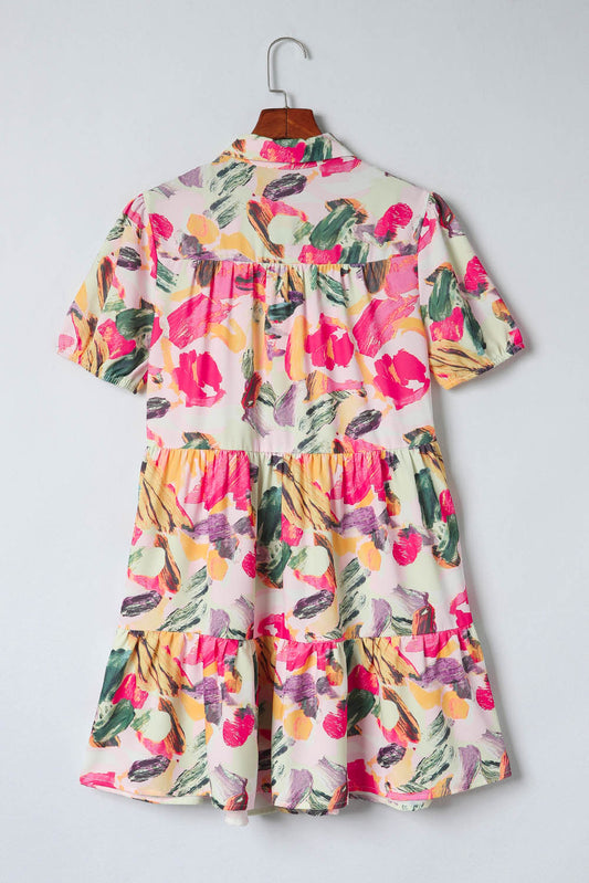 Tiered Notched Balloon Sleeve Buttoned Dress
