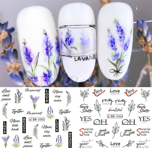 12pcs Black Leaves Letter Nail Stickers Water Transfer Decals Purple Flower Lace Sliders Decorations Manicure Charm Foils LABN
