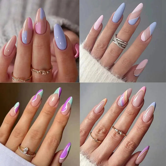 Simple French Wearable False Nails Almond Colorful Stripes Colorblock Design Manicure Fake Nails Line Full Cover Press On Nail