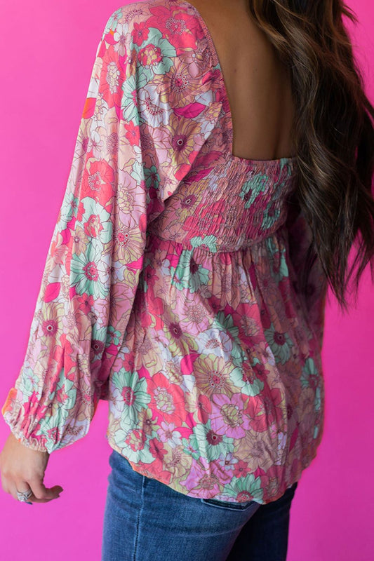 Smocked Printed Square Neck Balloon Sleeve Blouse
