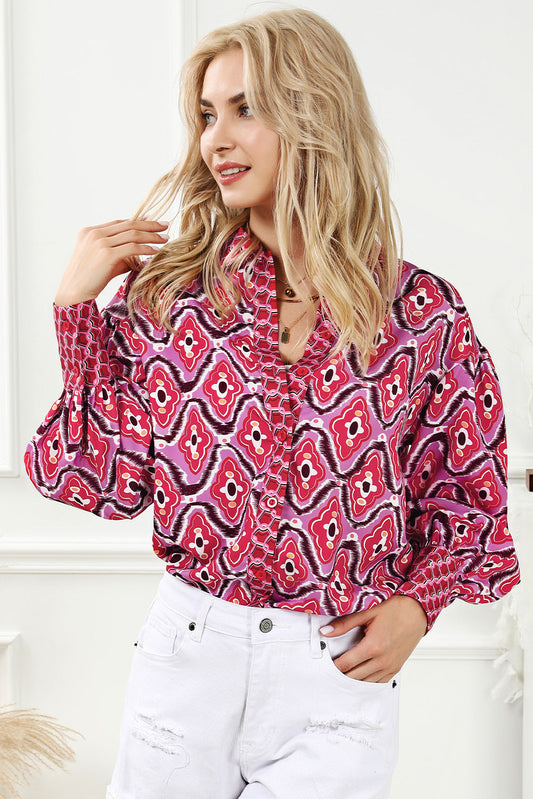 Plus Size Printed Tie Neck Balloon Sleeve Blouse