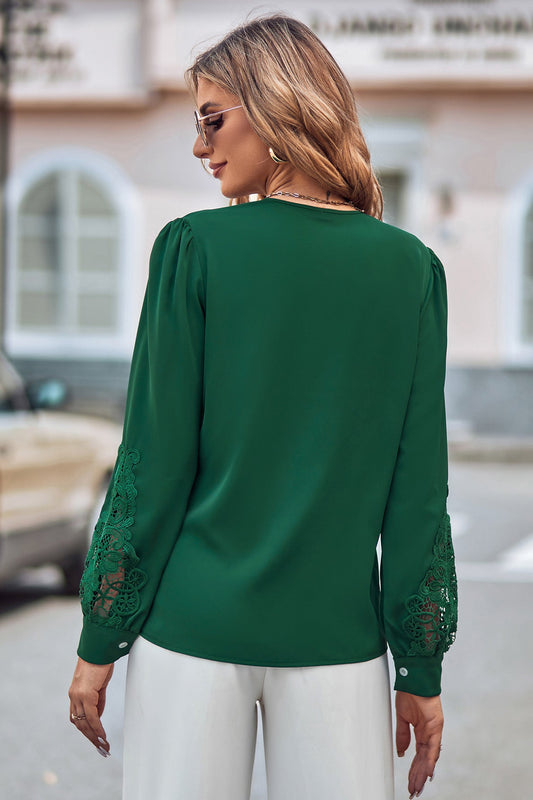 Spliced Lace V-Neck Puff Sleeve Shirt