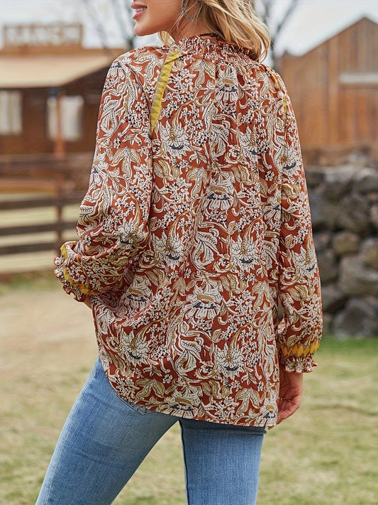 Plus Size Frill Printed V-Neck Long Sleeve Blouse