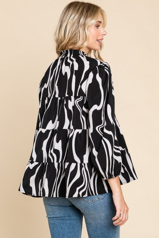 Double Take Full Size Printed Ruffle Trim Balloon Sleeve Shirt