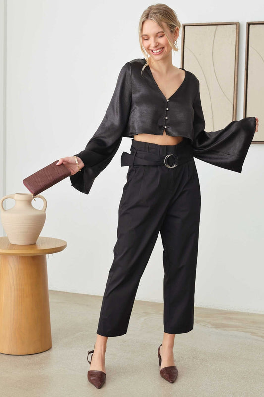 Tasha Apparel Satin Rhinestone Buttons Closure Crop Top