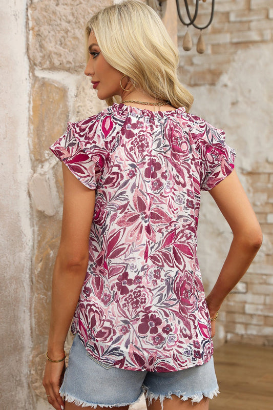 Printed V-Neck Tie Front Flounce Sleeve Blouse