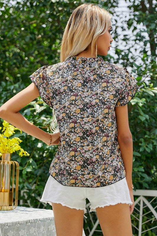 Ruffled Printed Mock Neck Short Sleeve Blouse