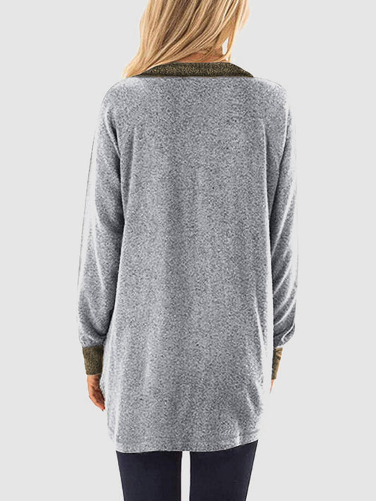 Leopard V-Neck Decorative Button Long Sleeve Blouse