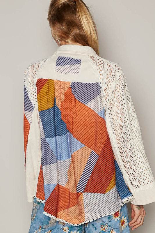 POL V-Neck Lace Balloon Sleeve Exposed Seam Top