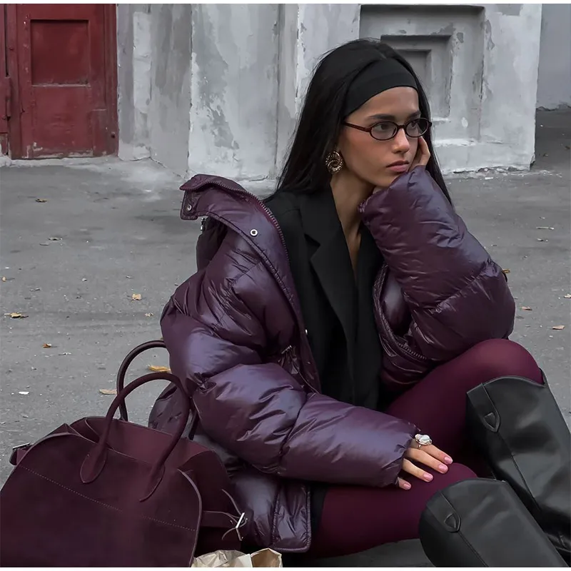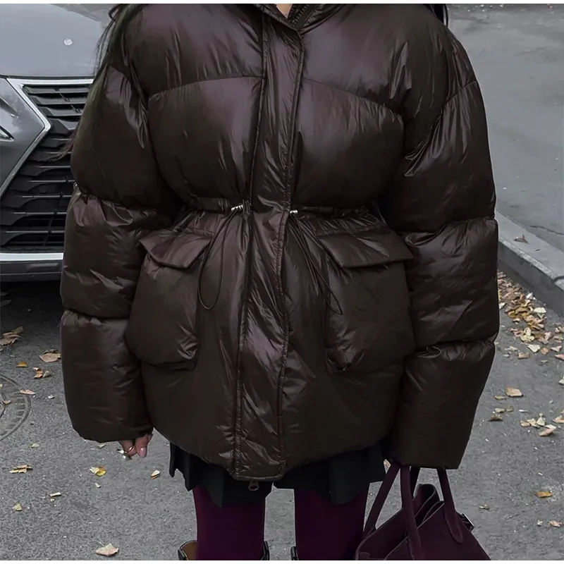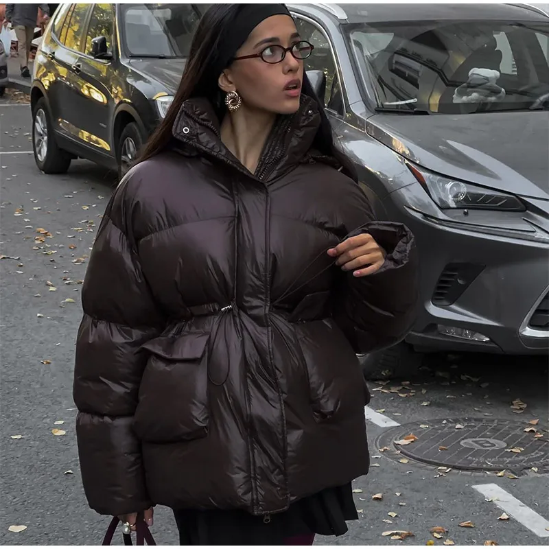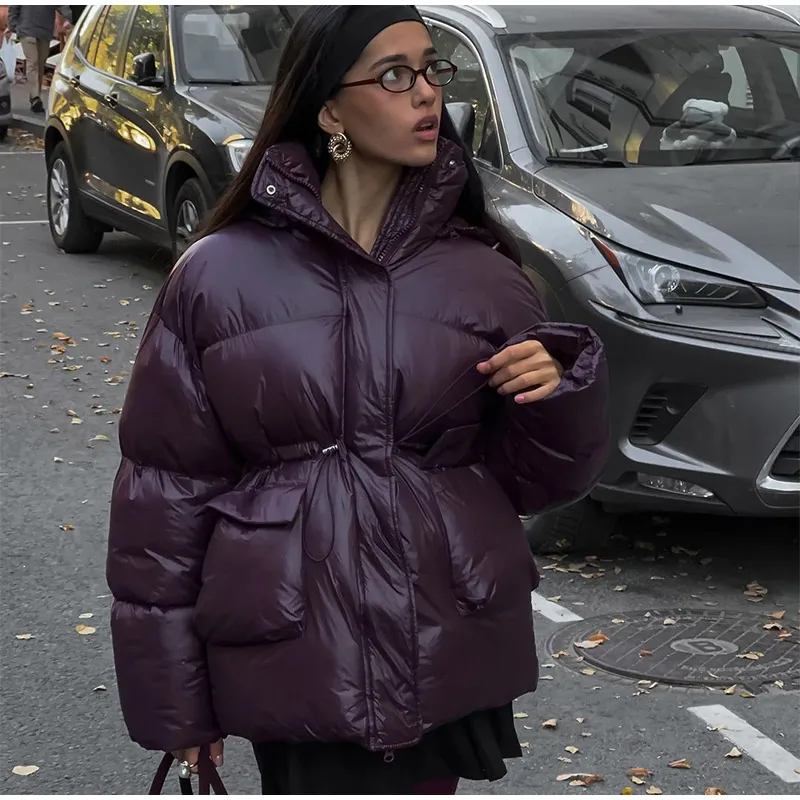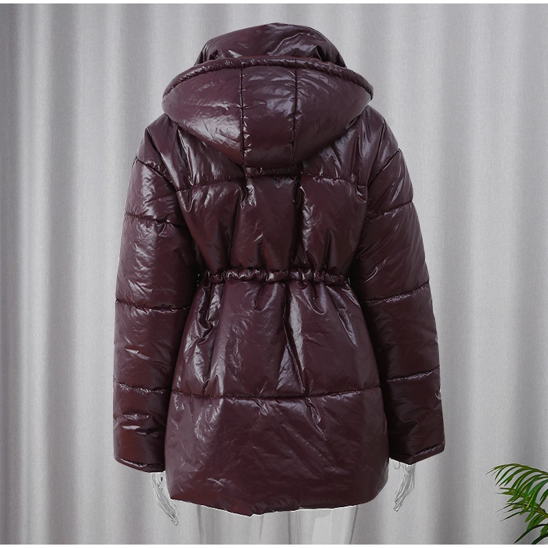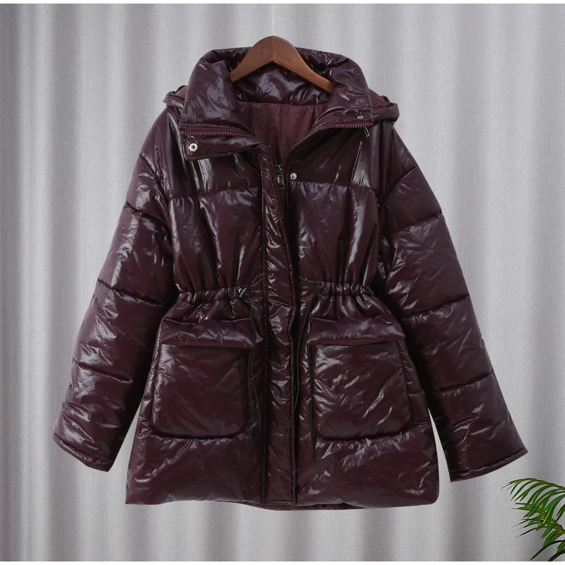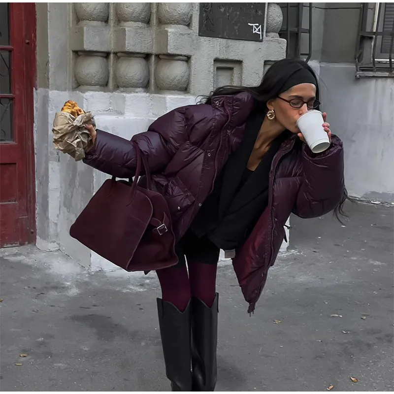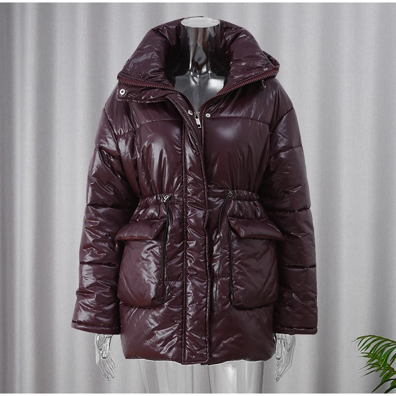 Casual Burgundy Lace Up Down Jacket Women Chic Lapel Button Pocket Thick Cotton Coat 2024 Autumn Winter Lady Highstreet Outwear