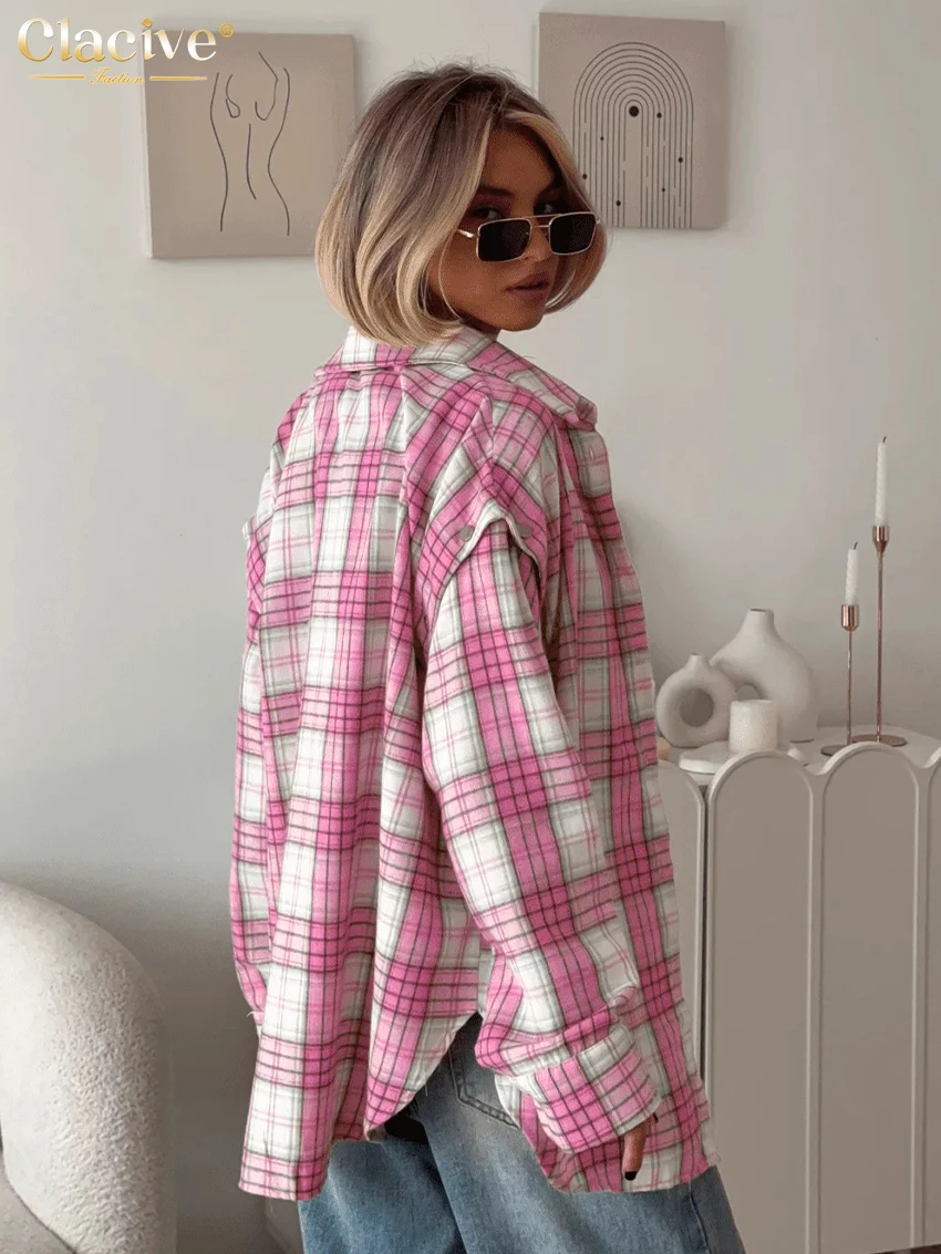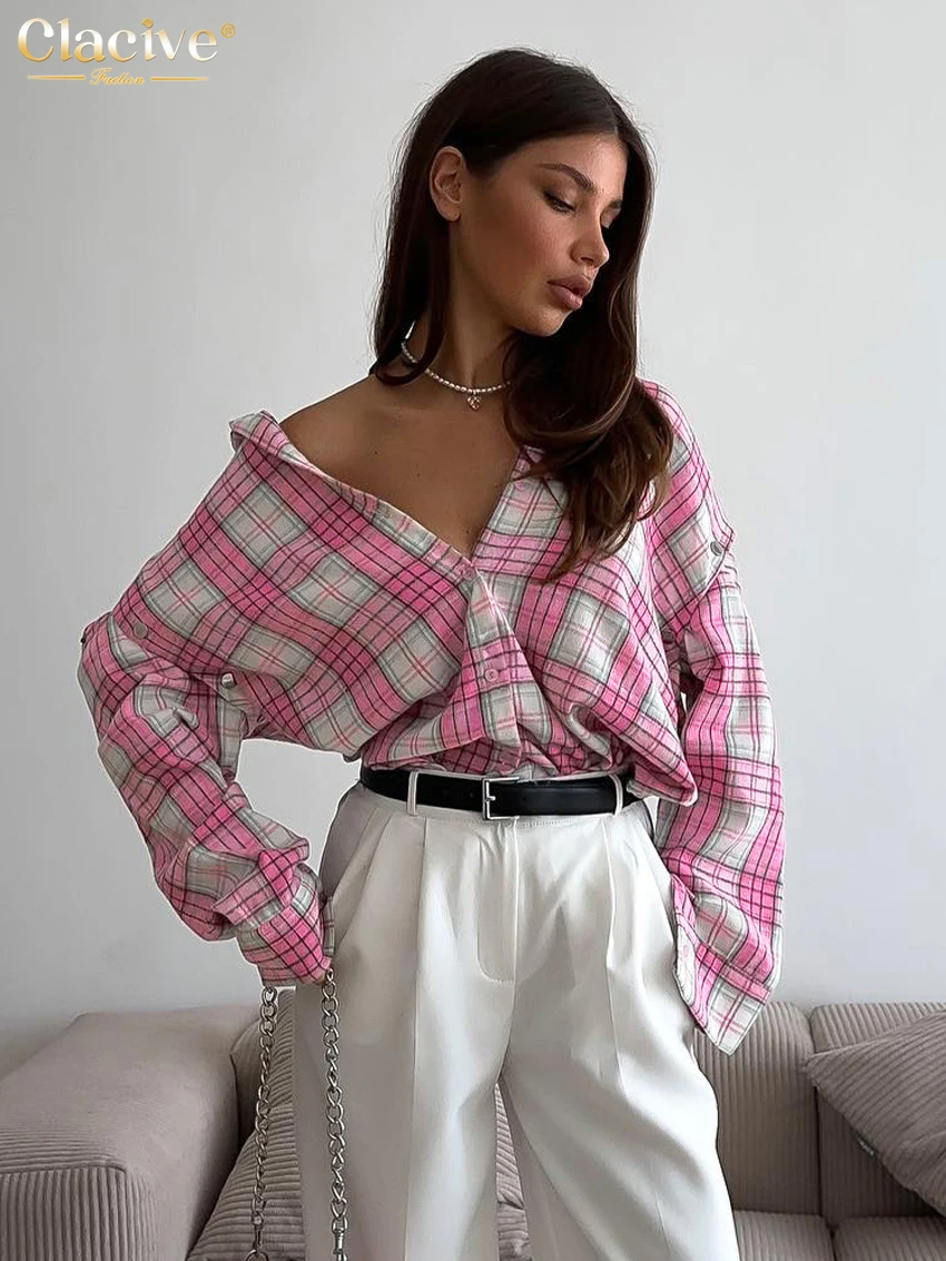 Clacive Fashion Loose Plaid Office Women's Shirt Vintage Lapel Long Sleeve Shirts Elegant Classic Blouse Top Female Clothing