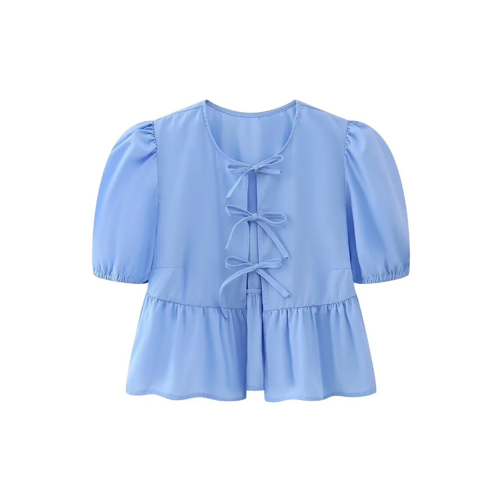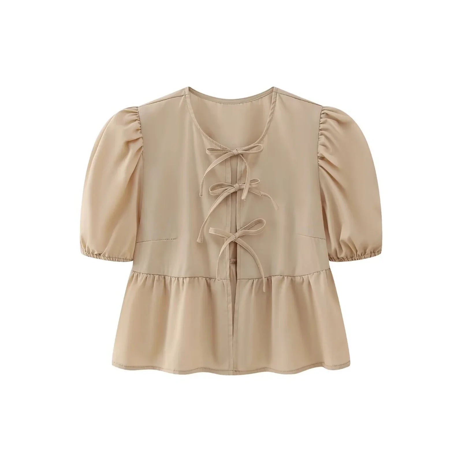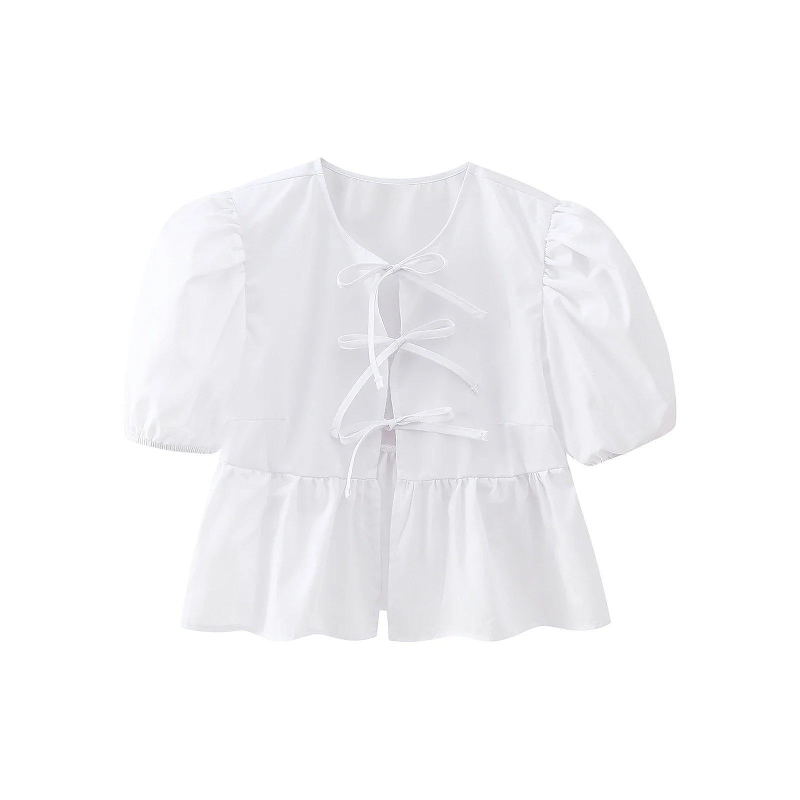 Combhasaki Women's Elegant Kawaii Summer Peplum Blouse Tops Short Puff Sleeve Round Neck Bow Tie-Up Front Babydoll Flare Shirts