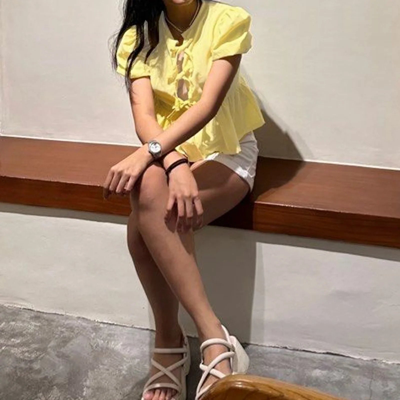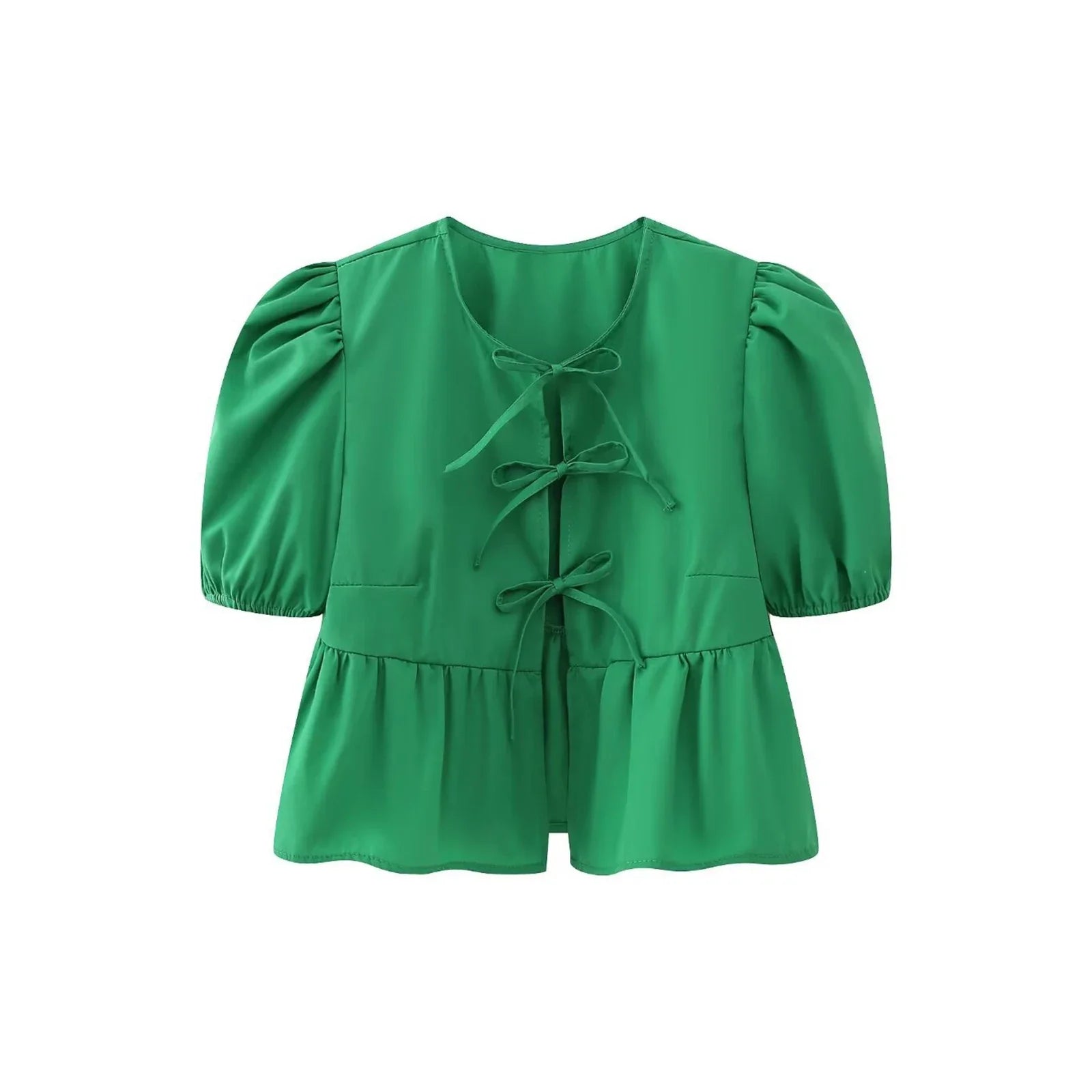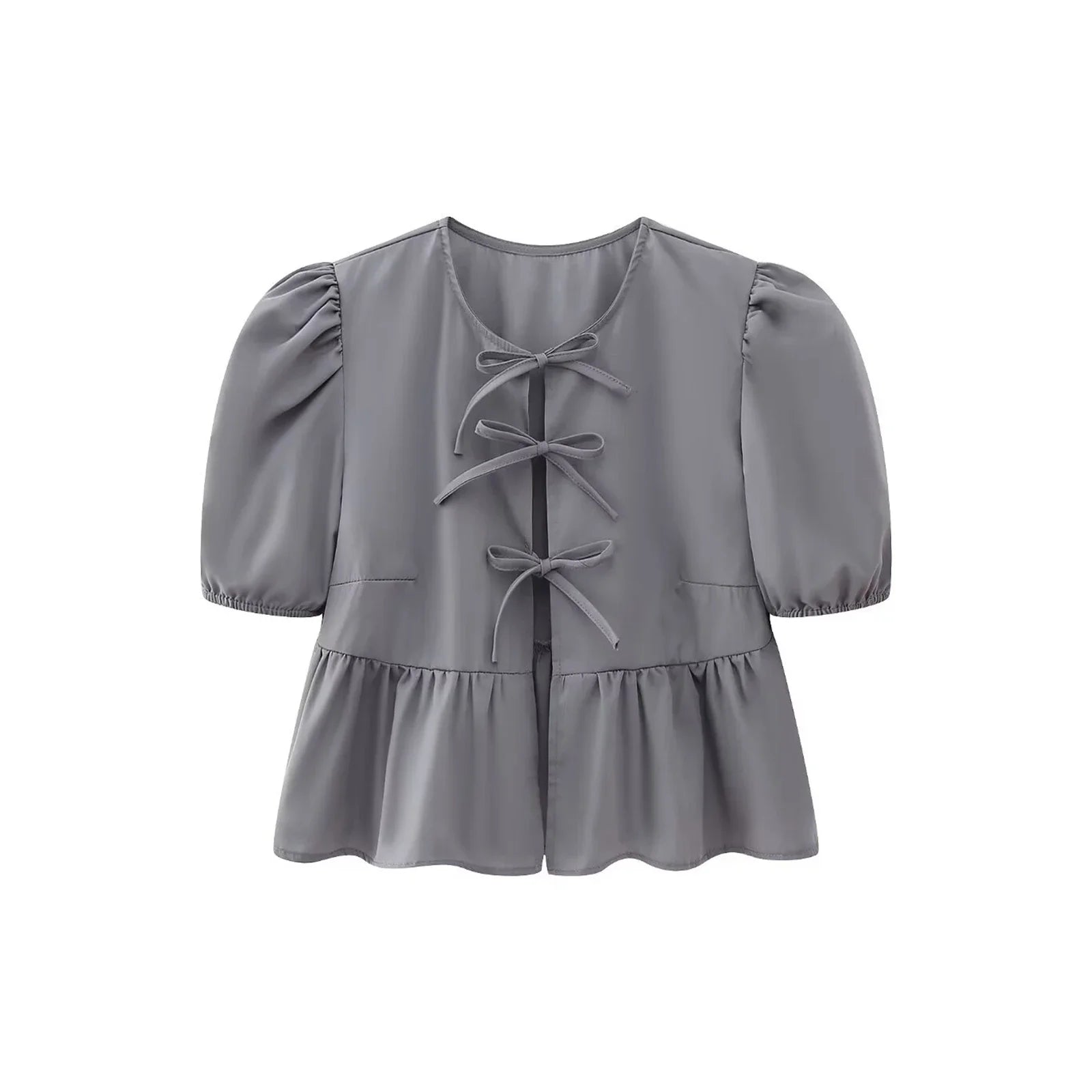 Combhasaki Women's Elegant Kawaii Summer Peplum Blouse Tops Short Puff Sleeve Round Neck Bow Tie-Up Front Babydoll Flare Shirts