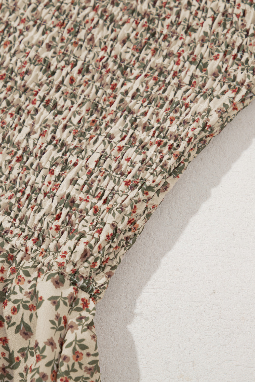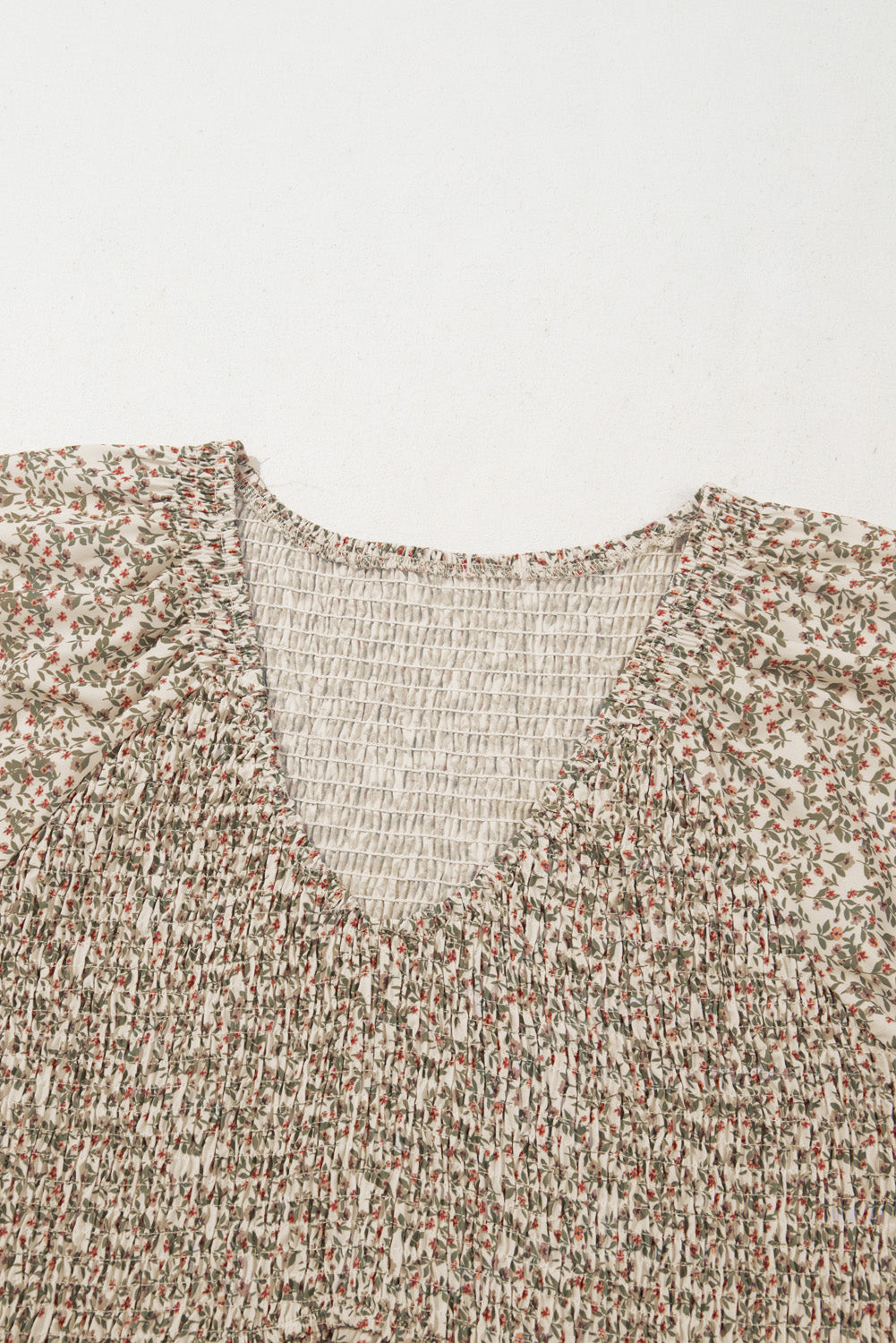 - V neck top has puff sleeve, smocked design with a peplum waist