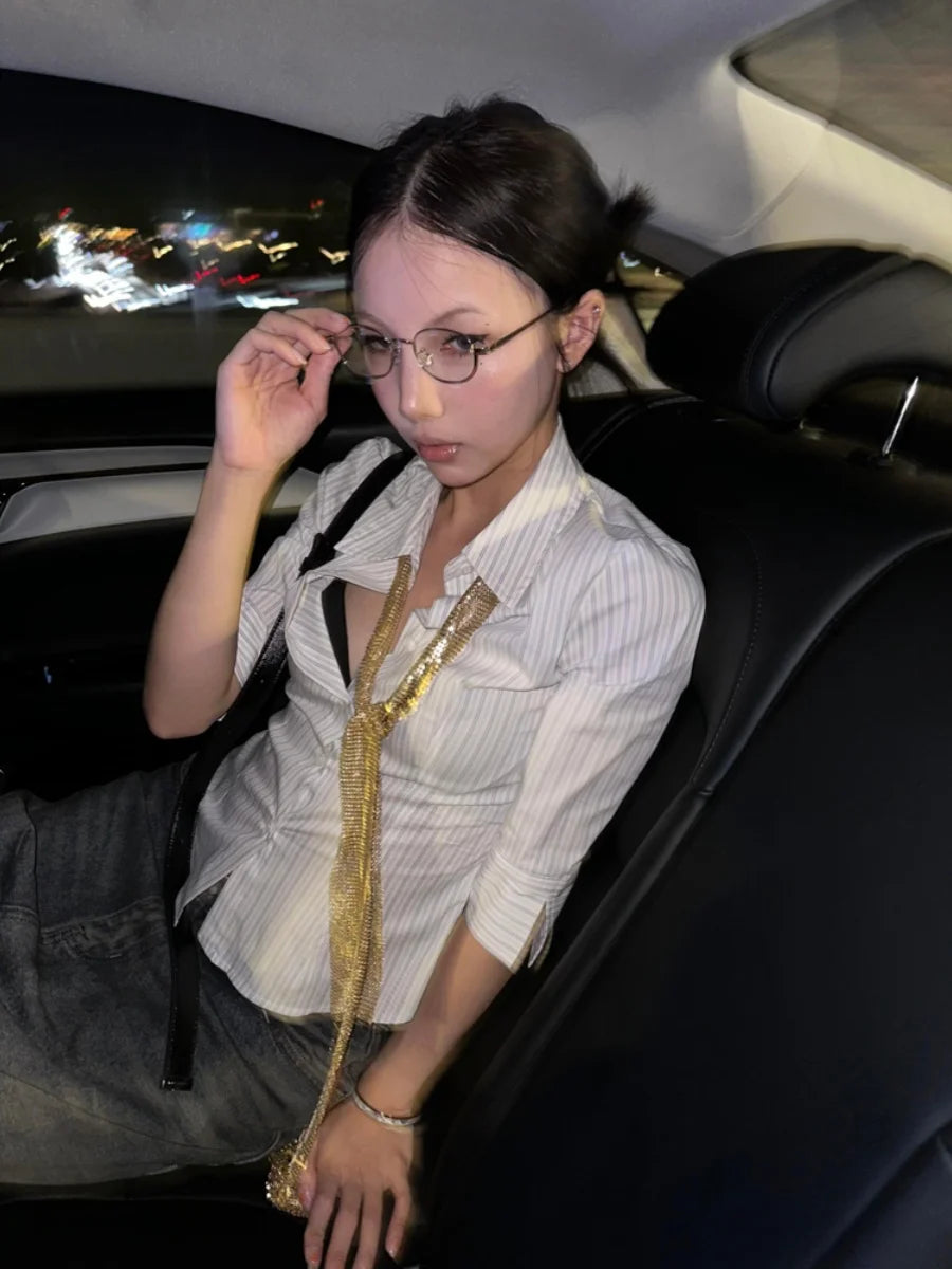 Genayooa Korean Fashion Shirt Women Striped Three Quarter Slim Shirt Y2k Vintage Tops Streetwear Japanese 2000s Retro Shirts