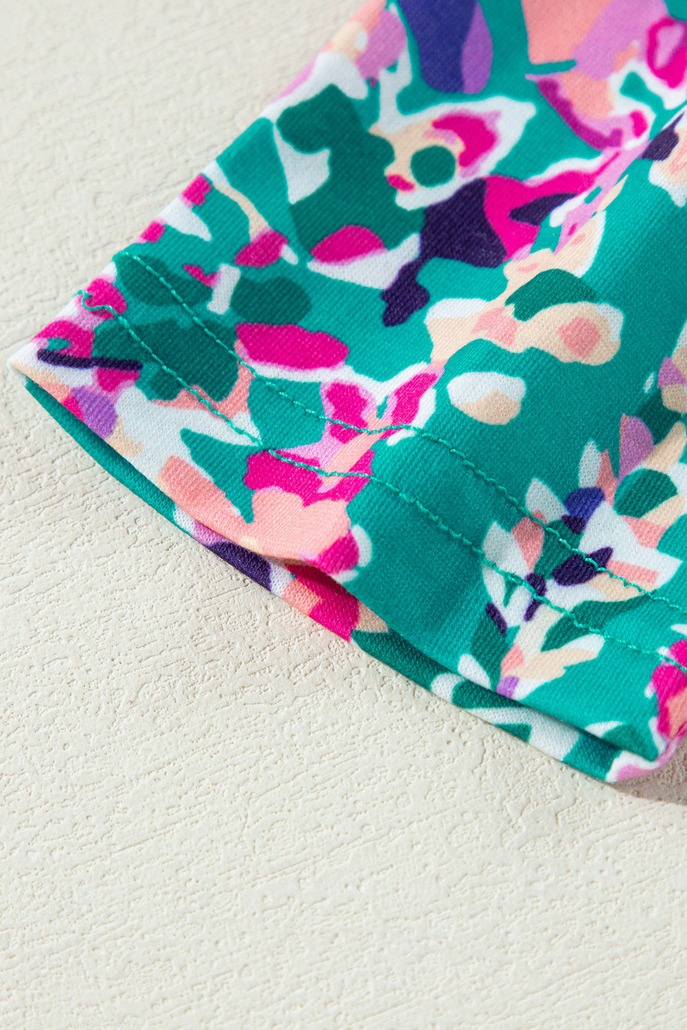 Green Floral Pleated Round Neck Long Sleeve Blouse