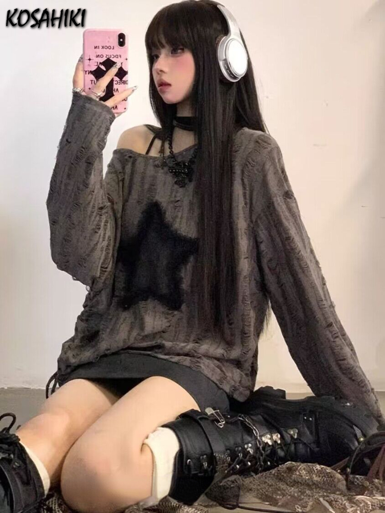 Grunge Hole T-shirt Women Fashion Star Print Y2k Aesthetic Loose Tees Kpop Fairycore Ripped Tshirt Harajuku Gothic Streetwear