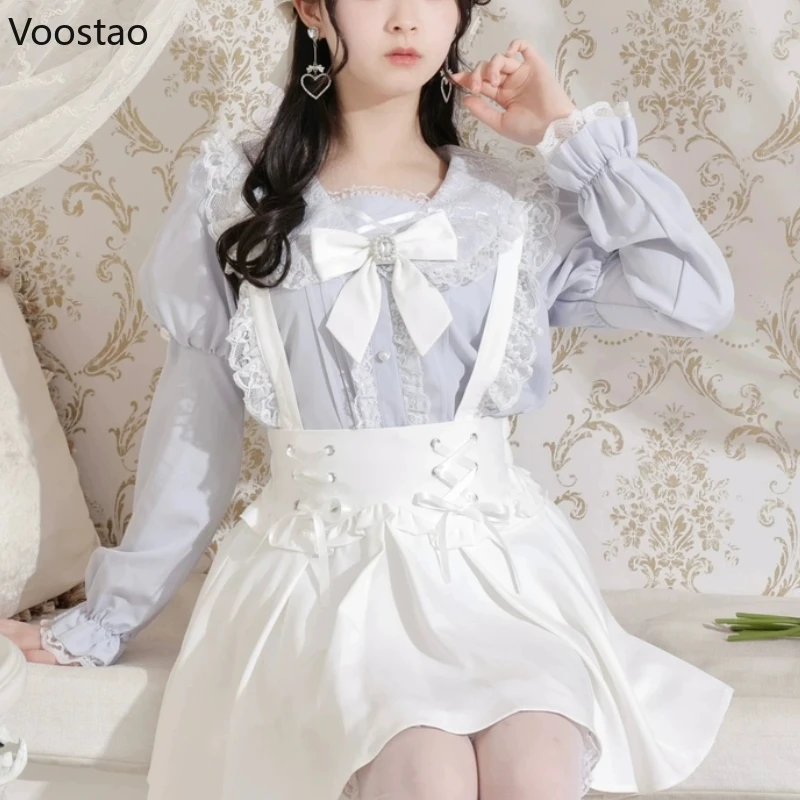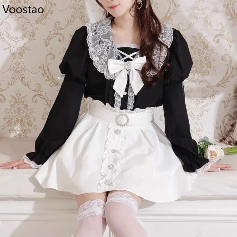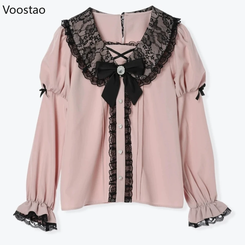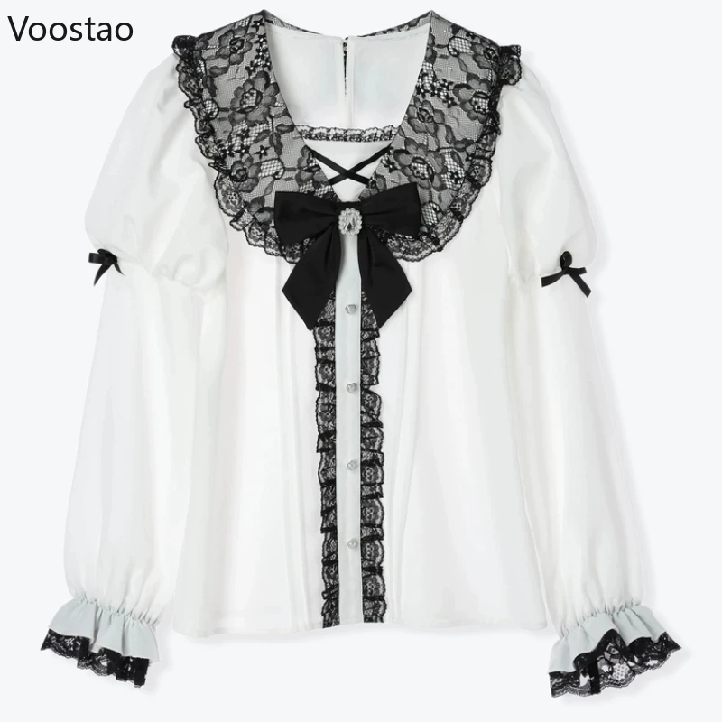 Japanese Gothic Lolita Shirt Women Harajuku Jirai Kei Bow Long Lantern Sleeve Blouses Y2k Aesthetic Elegant Sweet Clothes Tops
