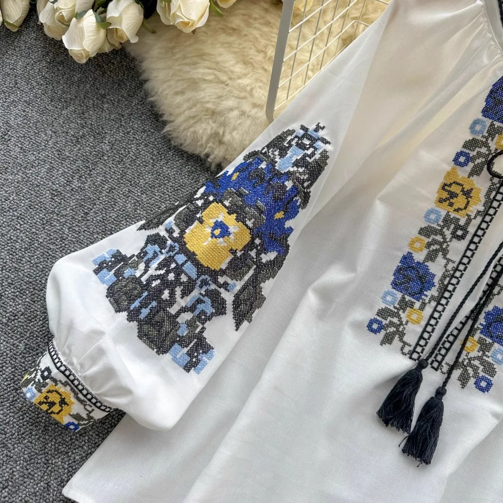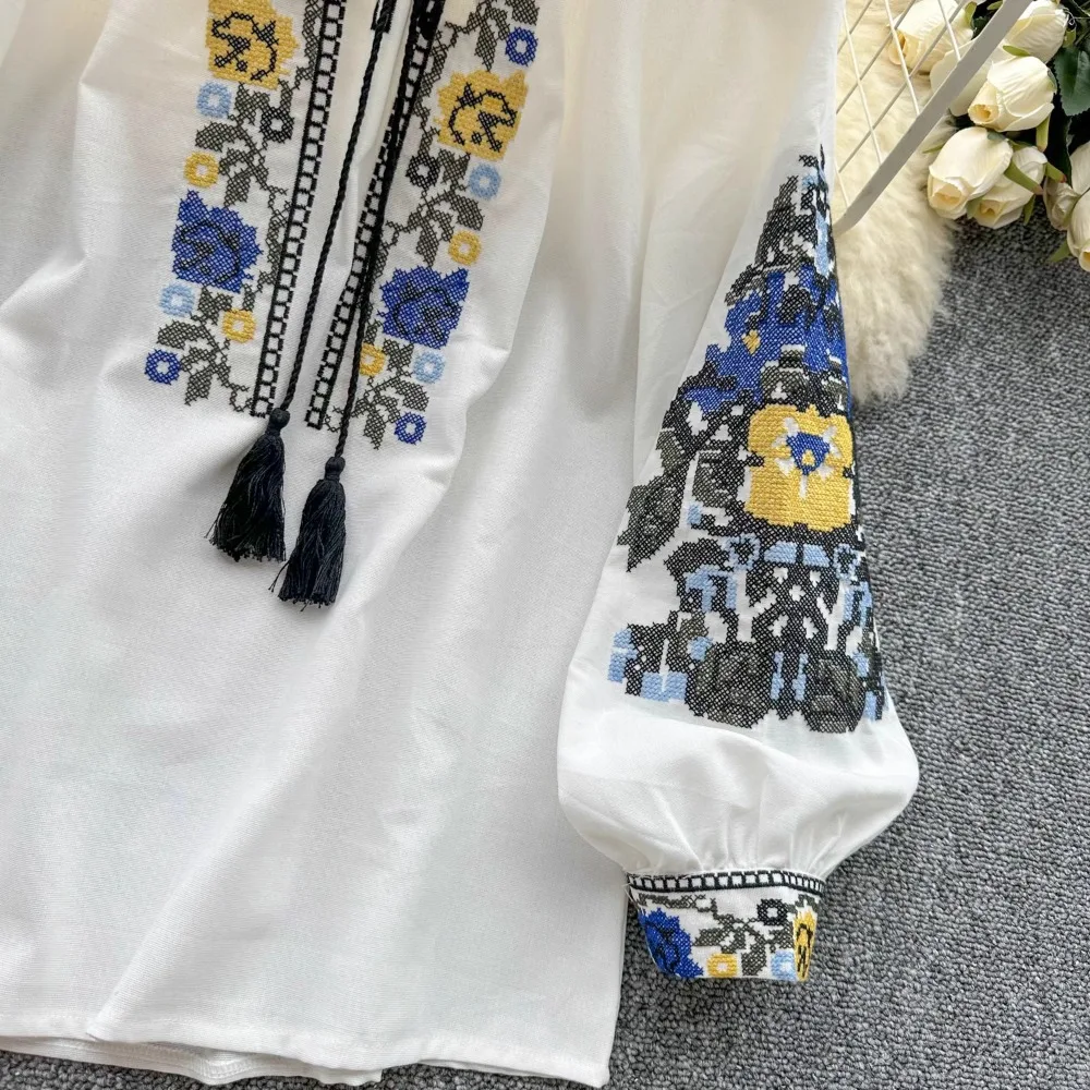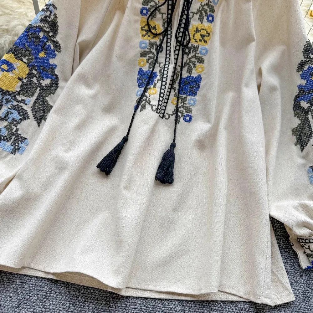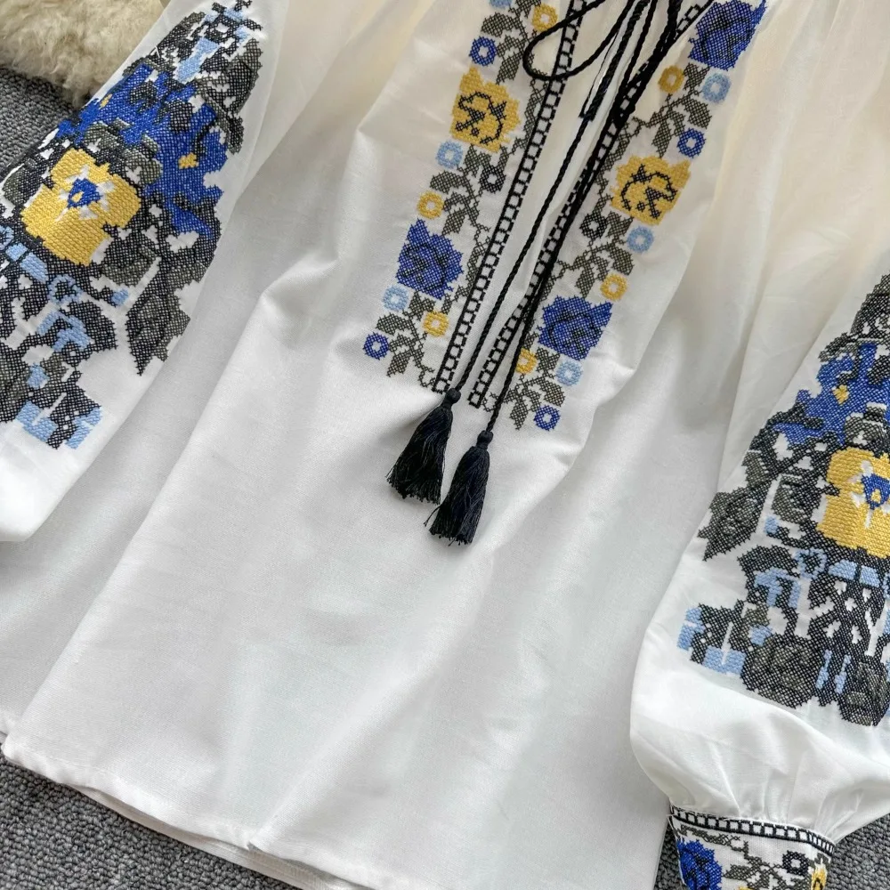Neploe Fresh O Neck Lantern Sleeve Pullover Panelled Mujer Sweet Lace Up All-match Embroidery Shirt New Heavy Tassels Blouses