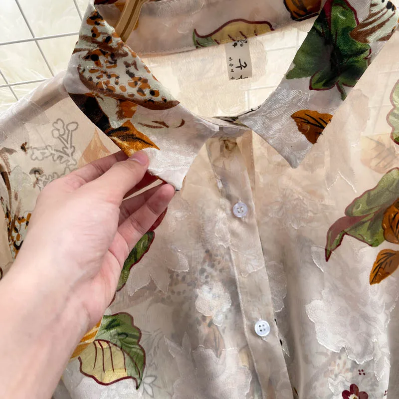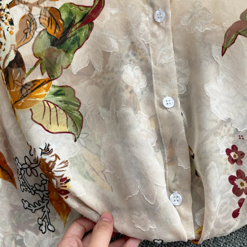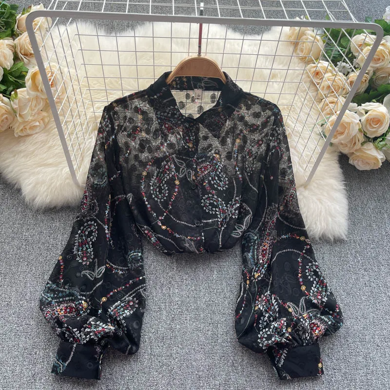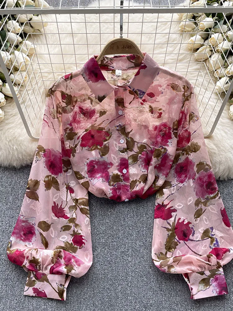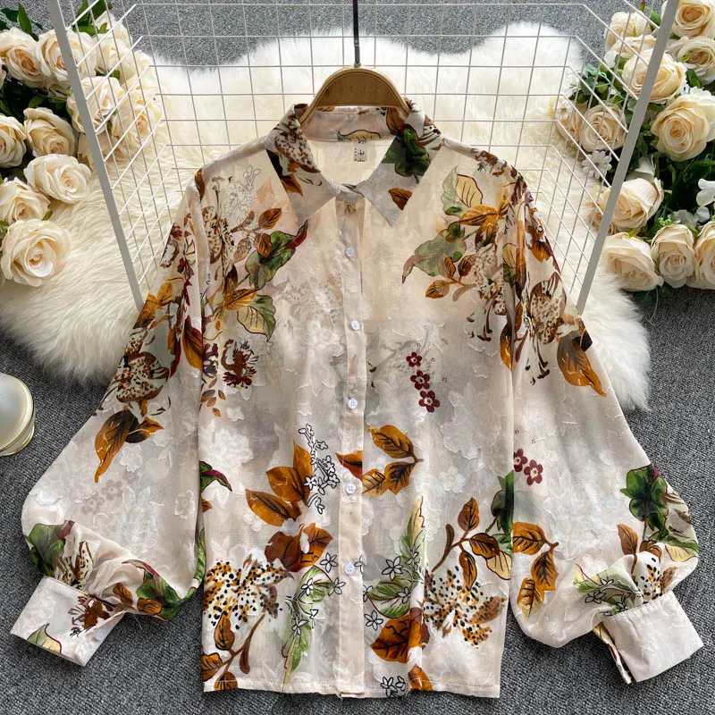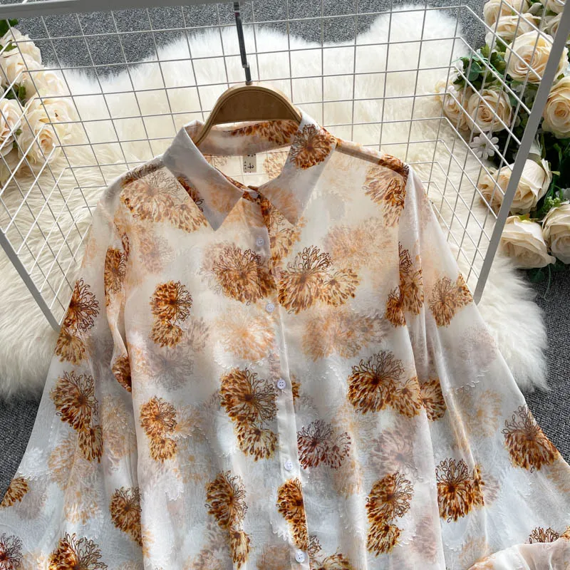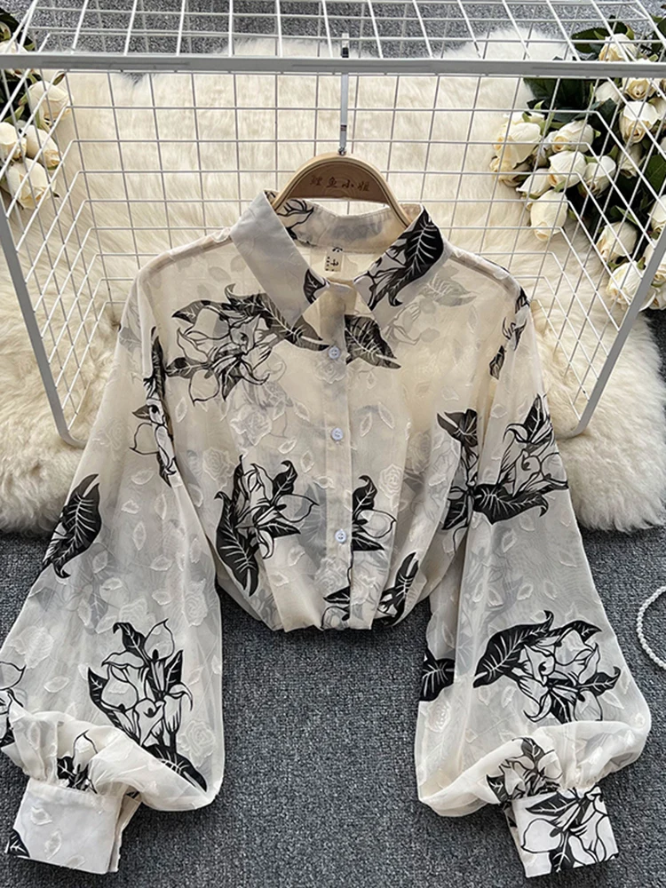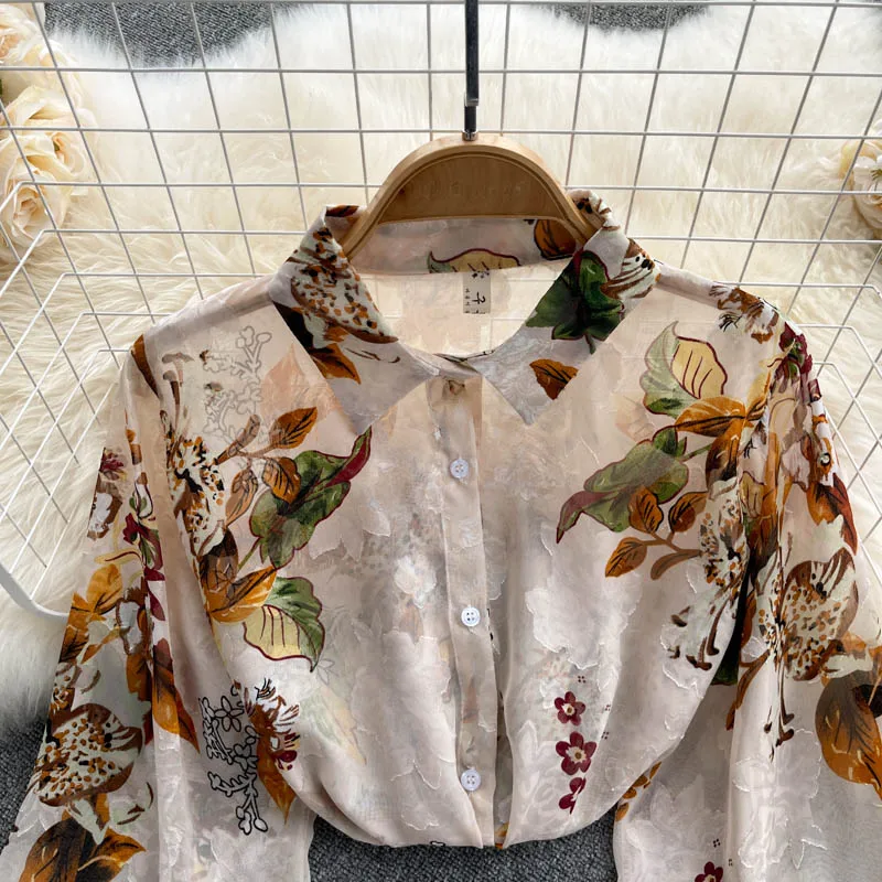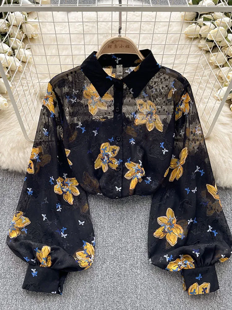Spring Autumn Temperament Fashion Retro Chiffon Floral Blouses Print Loose Lapel Puff Sleeve Top Button Up Shirt Female GD611