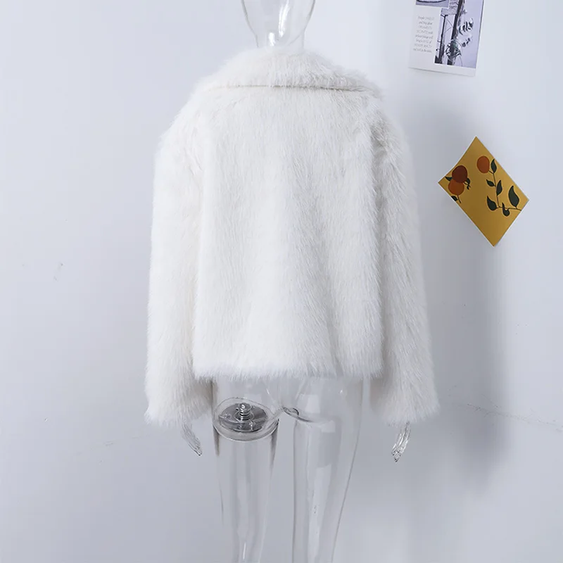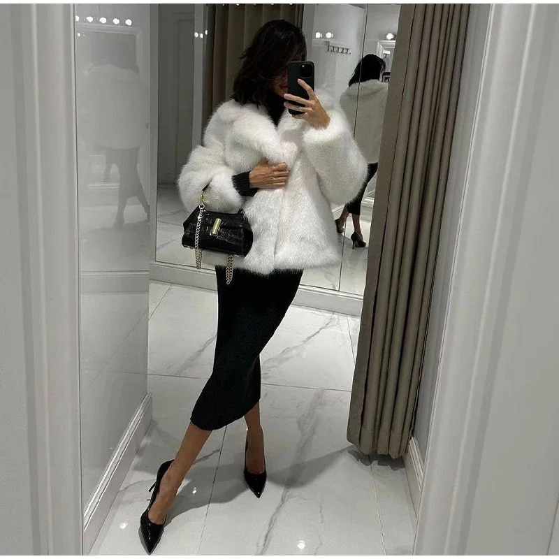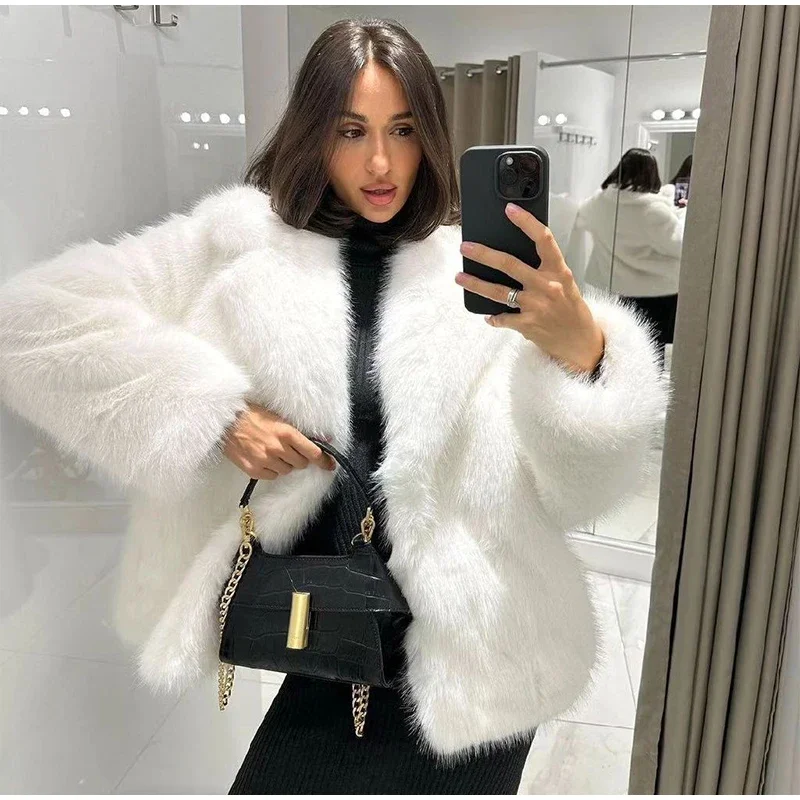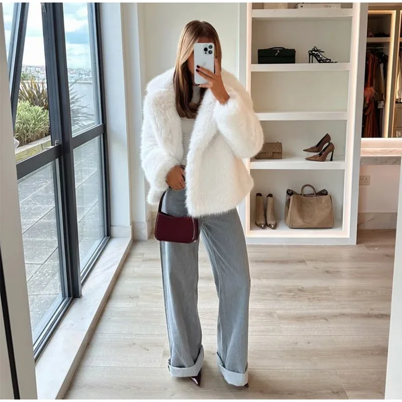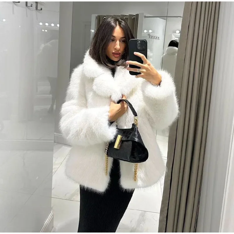 Street Women's White Faux Fur Coat Loose Lapel Long Sleeve Female Furry Jacket 2024 Autumn Winter Lady Luxury Plush Overcoat New