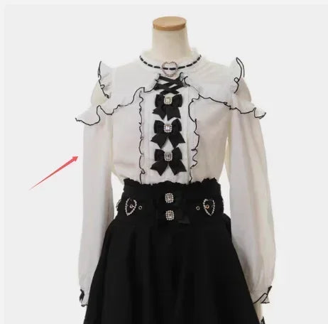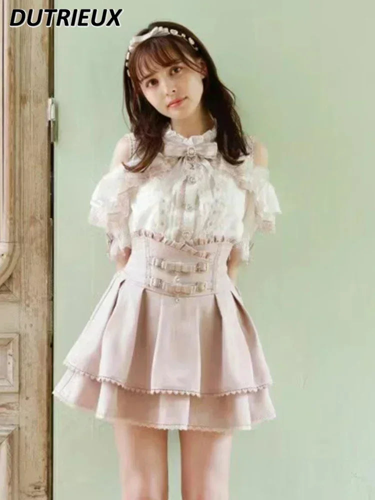 Sweet Cute Girls Short Sleeve Tops Japanese Style Mine Mass-Produced 2025 Summer Kawaii Slimming Lace Off-Shoulder Shirt